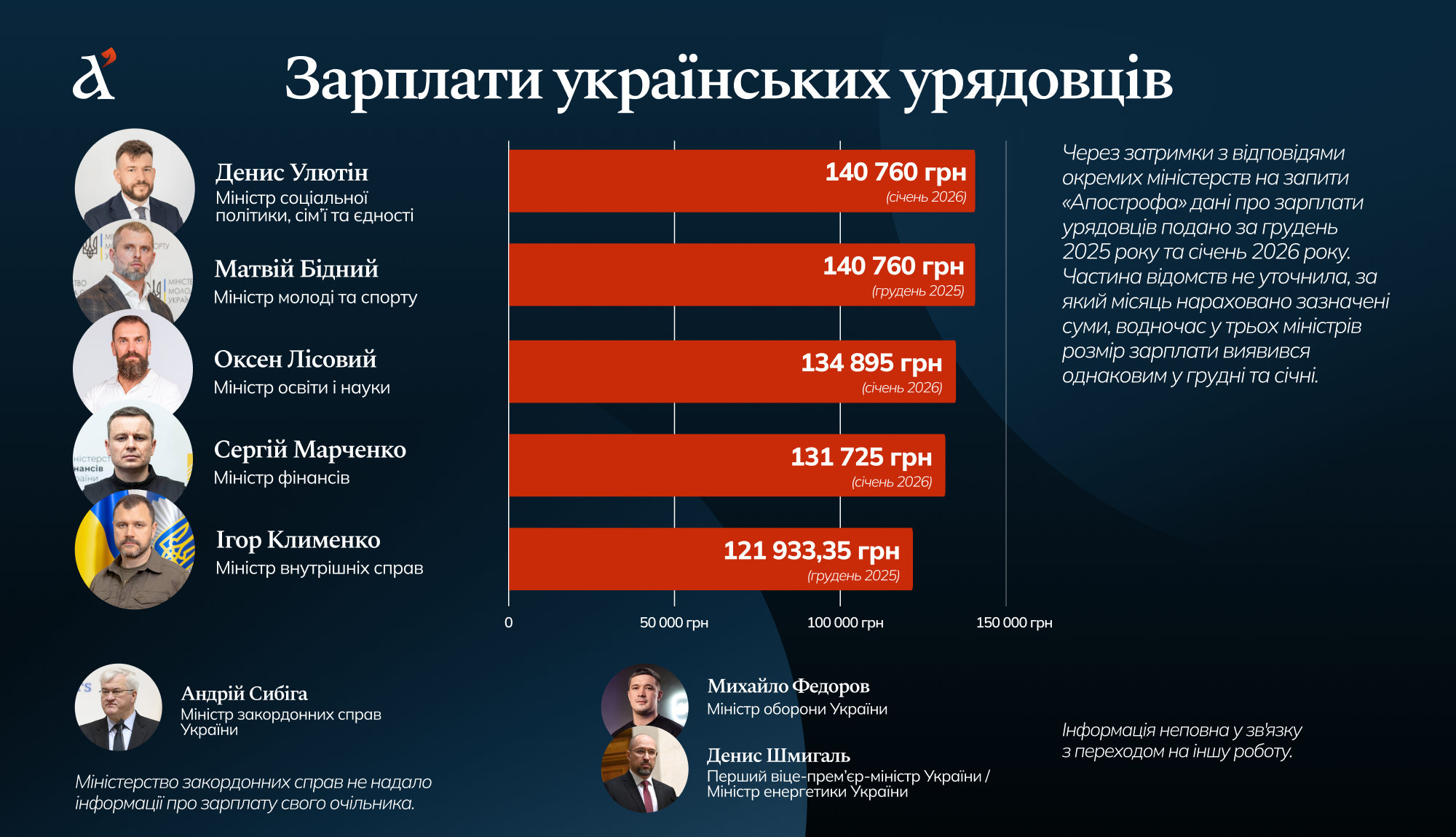 Важно отметить, что члены украинского правительства не получают премии, несмотря на то, что по закону имеют на них право. Некоторые ведомства просто не ответили на вопрос "Апострофа" о премиях, некоторые ответили, что их руководители не получали премии в январе 2026 года или в декабре 2025 года (в зависимости от того, о зарплате за какой месяц щла речь), а три ведомства сообщили, что их руководители не получали премии на протяжении всего 2025 года.