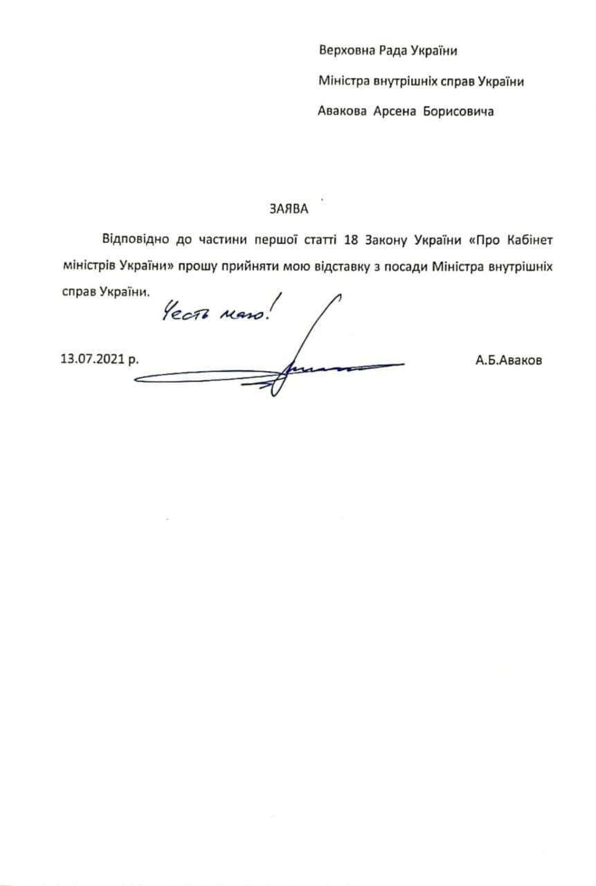 Во вторник, 13 июля, Министр внутренних дел Арсен Аваков подал в отставку.