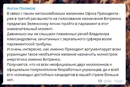 Народный депутат и волонтер Антон Поляков в Telegramнаписал, что если в Офисе президента так сильно хотят назначение Юрия Витренко на пост главы Минэнерго, то он приглашает президента в парламент. В таком случае Владимир Зеленский лично проконтролирует важный для него вопрос или "получит очередную пощечину от народных избранников, которые не позволяют вытирать об себя ноги".