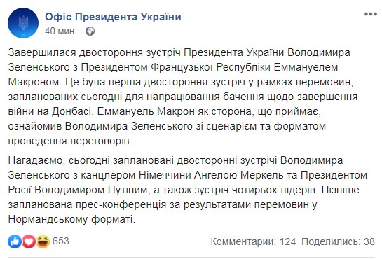 Дополнено. Как сообщили в Офисе президента, во время встречи Макрон "как принимающая сторона, ознакомил Владимира Зеленского сценарию и форматом проведения переговоров". Также в пресс-службе президента уточнили, что "это была первая двусторонняя встреча в рамках переговоров, запланированных сегодня для наработки видения завершения войны в Донбассе".