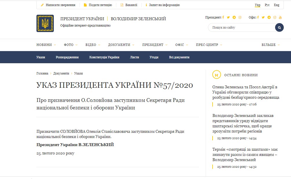 "Назначить Соловьева Алексея Станиславовича заместителем секретаря Совета национальной безопасности и обороны Украины", - говорится в документе.