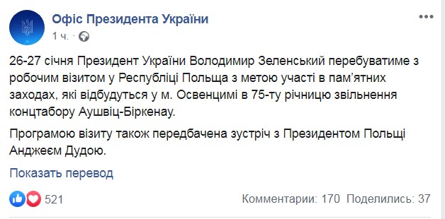 "26-27 января Президент Украины Владимир Зеленский будет находиться с рабочим визитом в Республике Польша с целью участия в памятных мероприятиях, которые пройдут в г. Освенциме в 75-ю годовщину освобождения концлагеря Аушвиц-Биркенау", - говорится в сообщении.