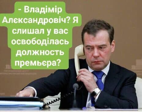 На ней можно увидеть бывшего премьер-министра России Дмитрия Медведева, который звонит президенту Владимиру Зеленскому и интересуется, действительно ли в правительстве освободилось место главы Кабмина.
