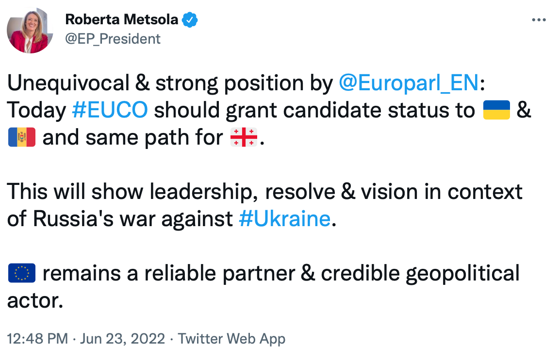 "Однозначная и сильная позиция Европарламента. Сегодня Еврокомиссия должна предоставить статус кандидата Украине и Молдове и тот же путь для Грузии", – заявила президент Европарламента Роберта Метсола в своем твиттере.
