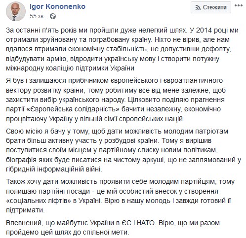 Стоит отметить, что в заявлении Кононенко нет информации о том, намерен ли он попасть в Раду через "мажоритарку".