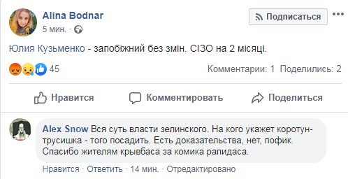 В частности, рассмотрев жалобу защиты на меру пресечения в виде содержания под стражей Юлии Кузьменко, Апелляционный суд Киева принял решение оставить без изменений решение Печерского суда Киева.