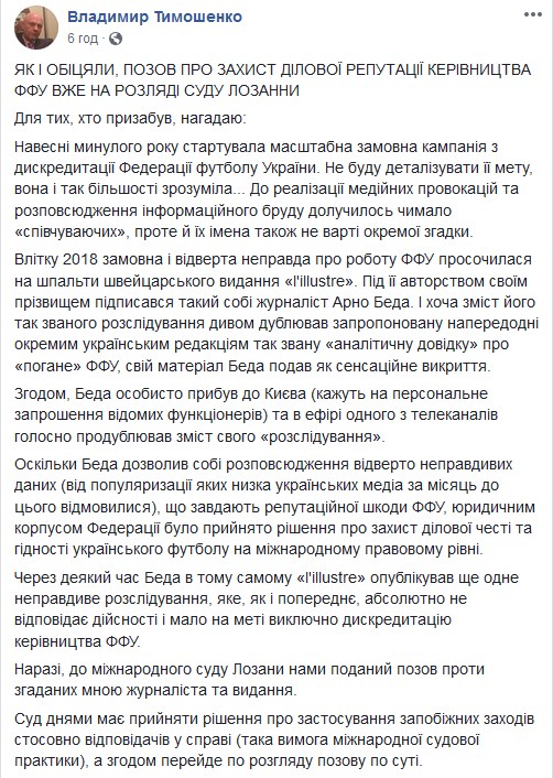 "Как и обещали, иск о защите деловой репутации руководства ФФУ уже на рассмотрении в суде Лозанны", - написал Тимошенко.