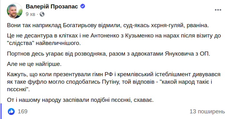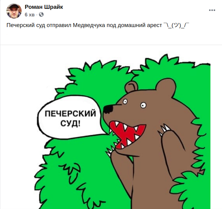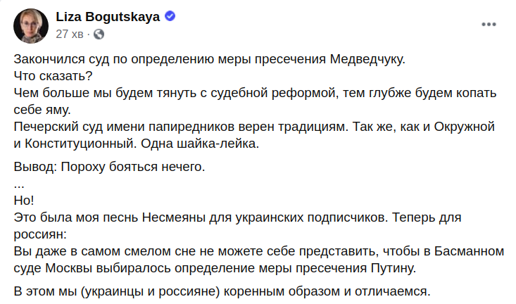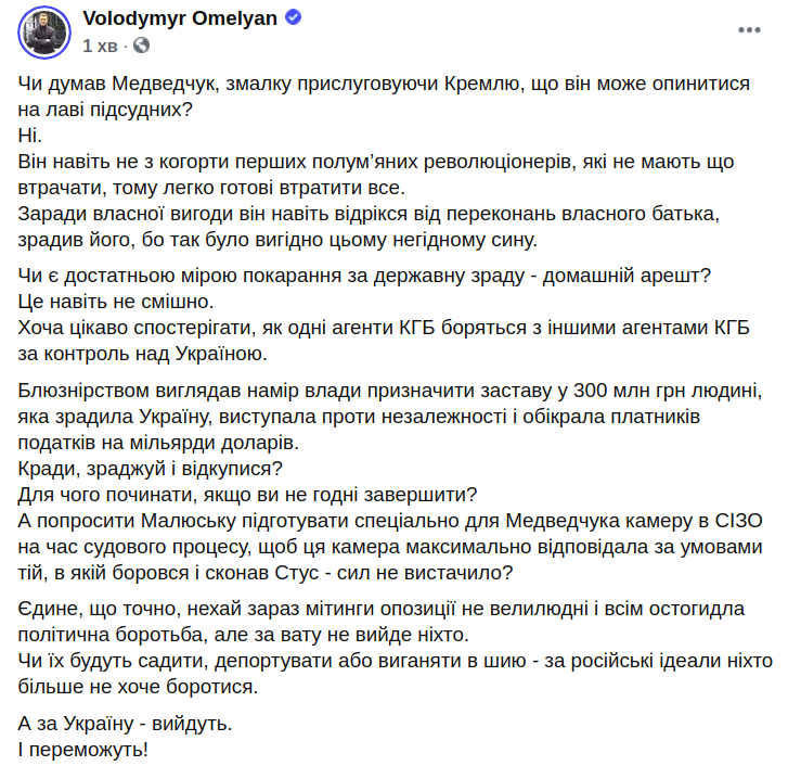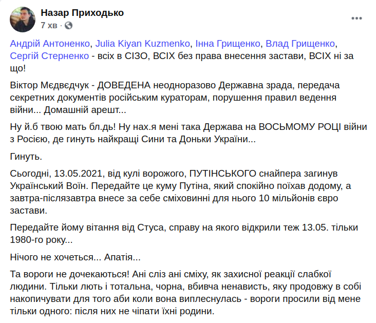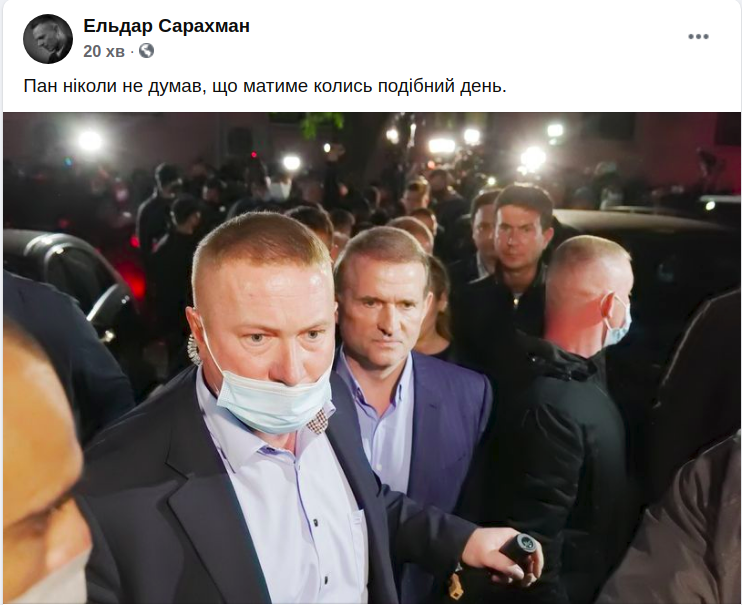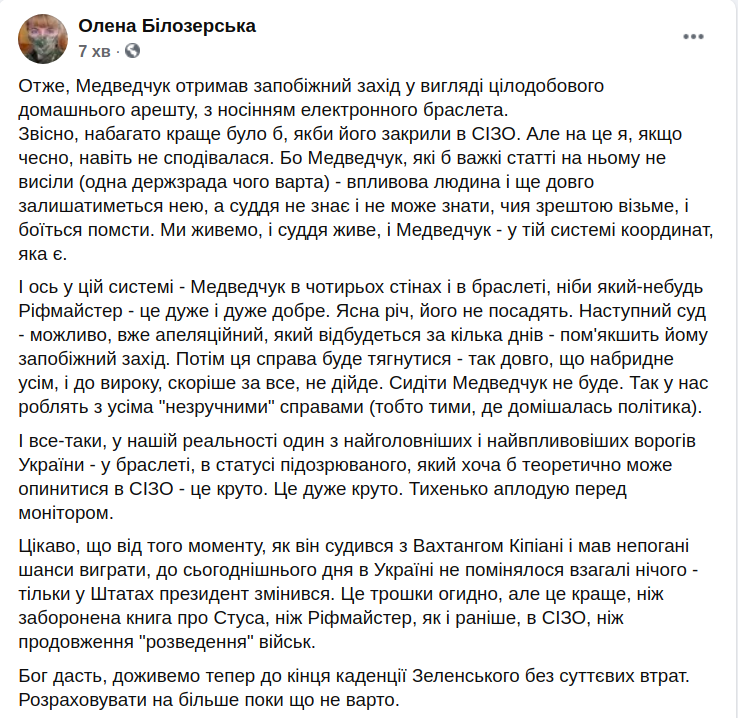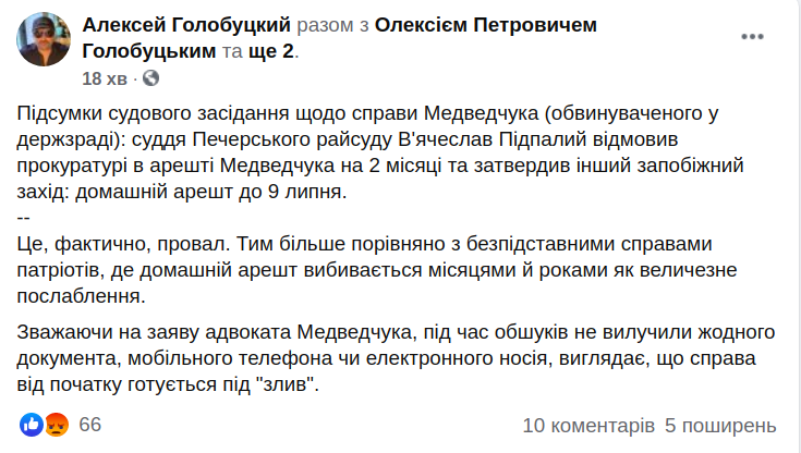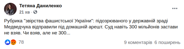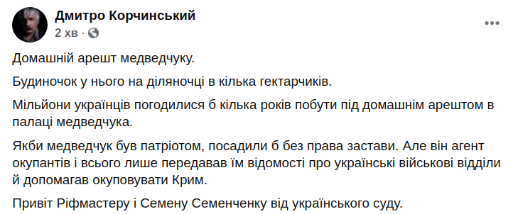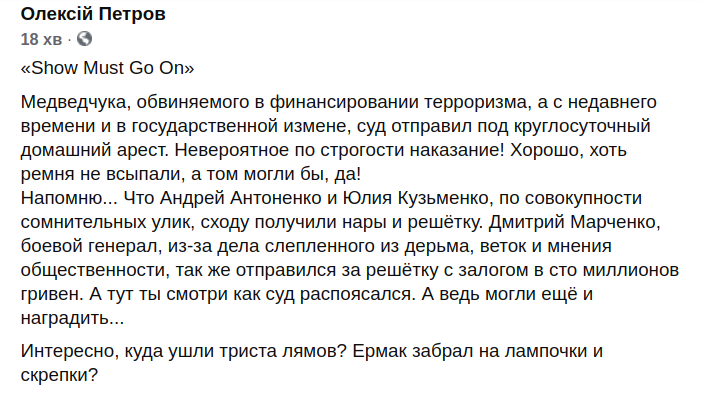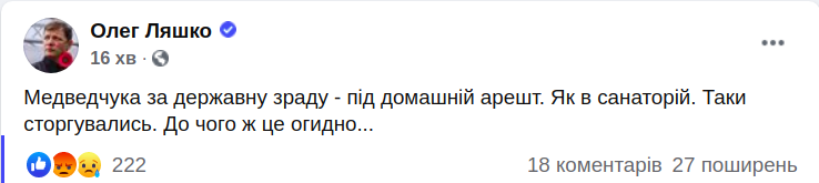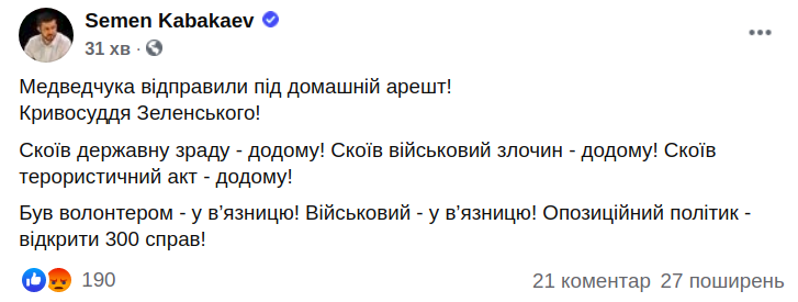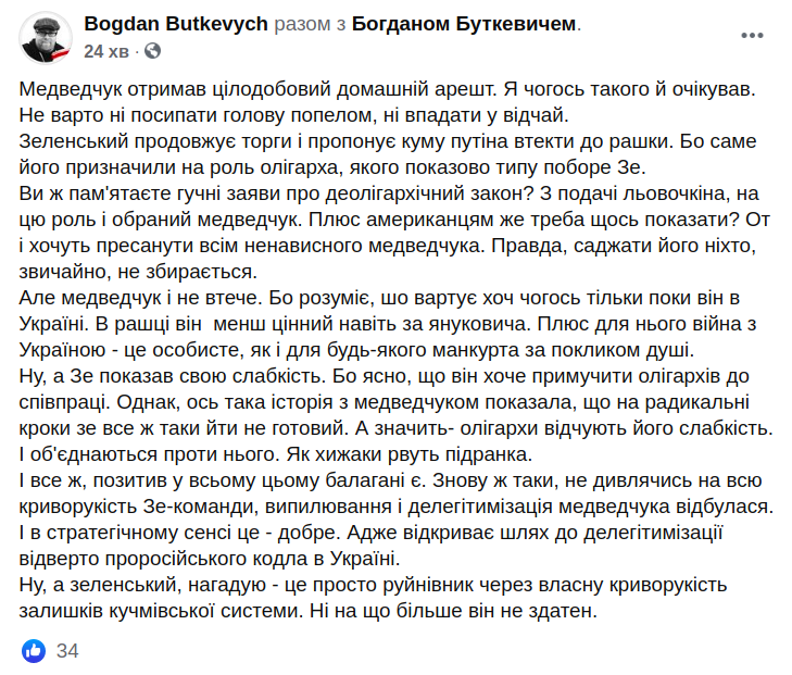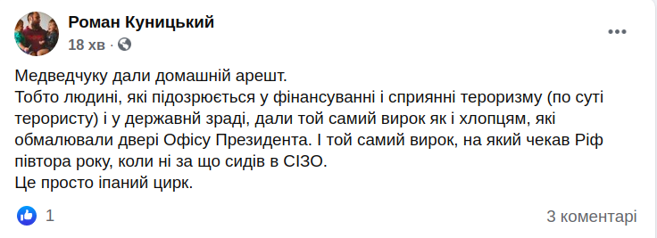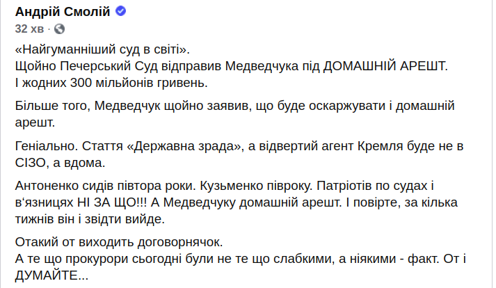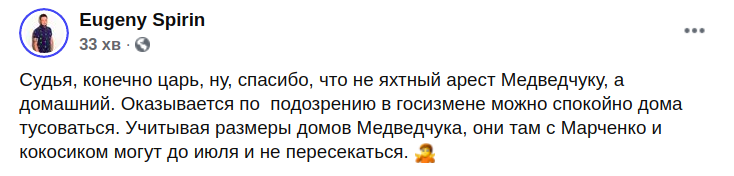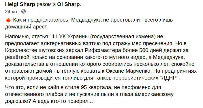 "Как и предполагалось, Медведчука не арестовали - всего лишь домашний арест. Напомню, статья 111 УК Украины (государственная измена) не предполагает альтернативных взятию под стражу мер пресечения. Но в Королевстве шутовских зеркал Риффмастера более 500 дней держат за решеткой только на основании какого-то мутного видео, а Медведчука, доказательства в отношении которого собирались несколько лет, спокойно отправляют в его дворец - в теплую кровать Оксаны Марченко. На предприятиях которой производится топливо для танков террористических "ЛДНР". Что это, если не хайп в стиле 95 квартала, не перфоменс для отечественного плебса и не пускание пыли в глаза американскому дядюшке? А ведь кто-то поверил...", - написал он.
