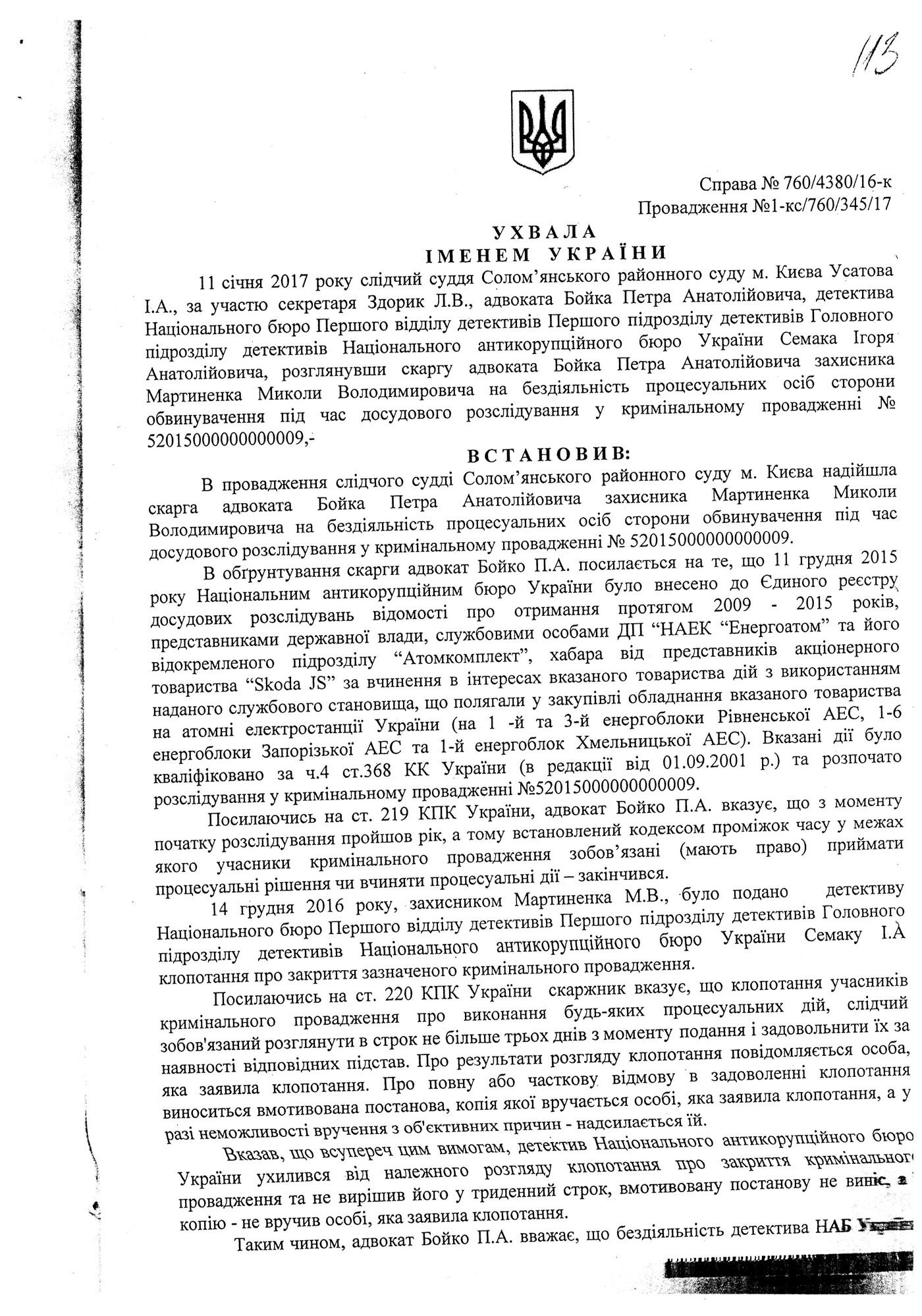 В понедельник, 16 января, Соломенский районный суд Киева огласил текст решения, которым обязал НАБУ в течение 10 дней закрыть так называемое дело Мартыненко. Поскольку суд не имеет права сам закрывать дело, то он обязал сделать это НАБУ в единственно возможной форме, которую определяет уголовно-процессуальное законодательство.