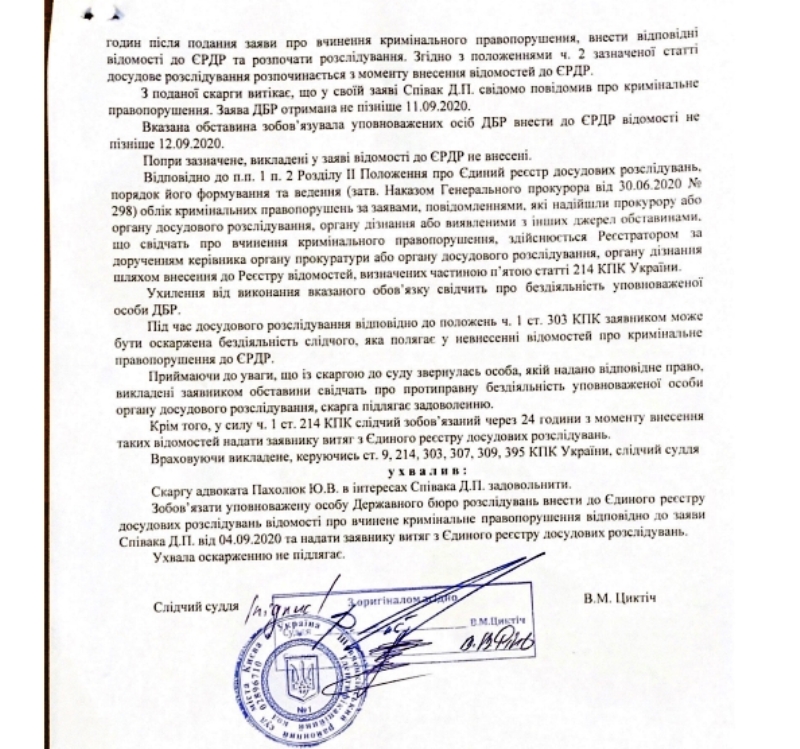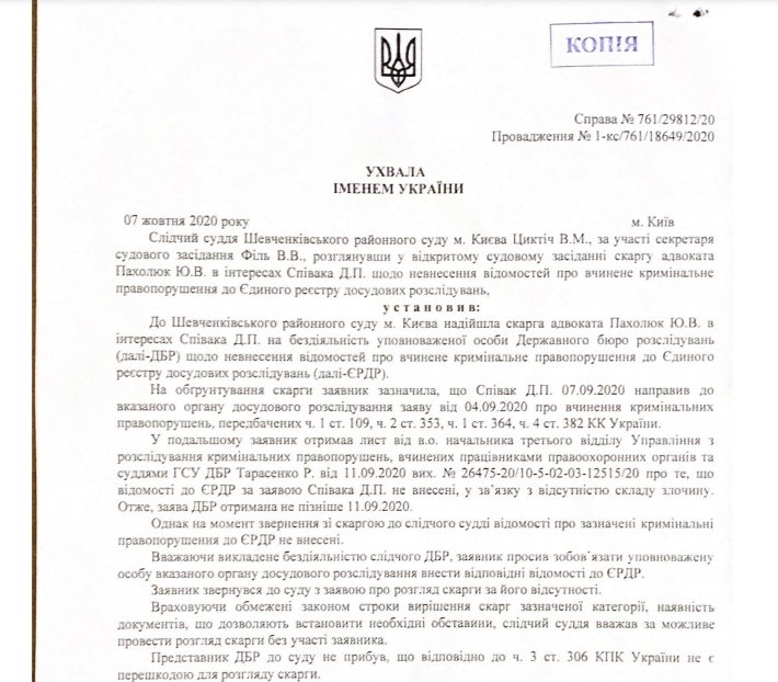 Так, 7 октября Шевченковский районный суд города Киева рассмотрел жалобу адвоката Дмитрия Спивака о том, что ГБР в течение 24 часов не внесло в Единый реестр досудебных расследований сведения об открытии дела по заявлению Спивака о правонарушениях директора НАБУ Сытника. Ранее телеведущий подал заявление относительно самовольного захвата власти Артемом Сытником и превышения им служебных полномочий - Сытник проигнорировал решение Конституционного суда о незаконности его назначения. ГБР не внесло данные в ЕРДР и не начало досудебное следствие в отношении изложенных фактов нарушений по ч.1 ст.109, ч.2 ст.353, ч.1 ст.364, ч.4 ст.382 УК Украины.