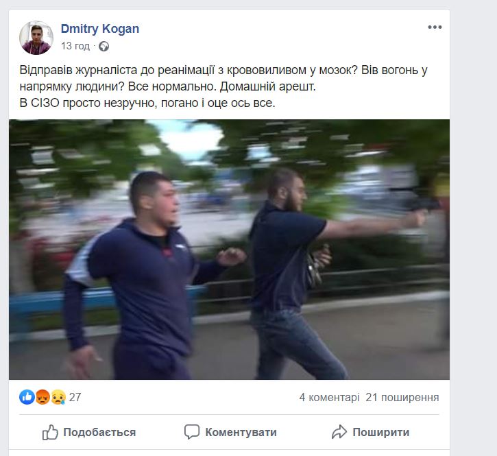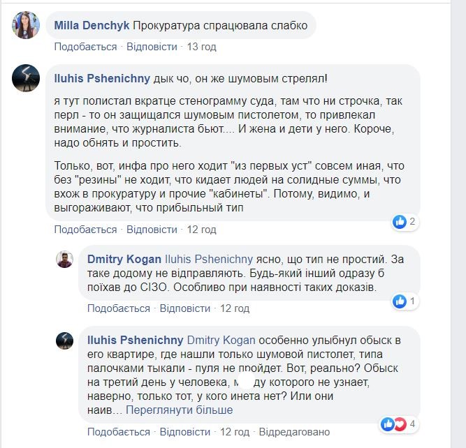 "Я тут полистал вкратце стенограмму суда, там что ни строчка, так перл - то он защищался шумовым пистолетом, то привлекал внимание, что журналиста бьют.... И жена, и дети у него. Короче, надо обнять и простить. Только, вот, инфа про него ходит "из первых уст" совсем иная", - пишет Iluhis Pshenichny.
