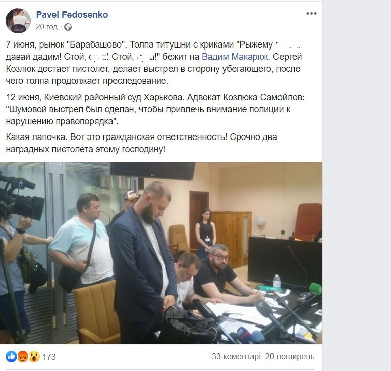 "7 июня, рынок "Барабашово". Толпа титушни с криками " бежит на Вадима Макарюка. Сергей Козлюк достает пистолет, делает выстрел в сторону убегающего, после чего толпа продолжает преследование. 12 июня, Киевский районный суд Харькова. Адвокат Козлюка Самойлов: "Шумовой выстрел был сделан, чтобы привлечь внимание полиции к нарушению правопорядка".