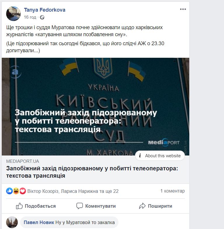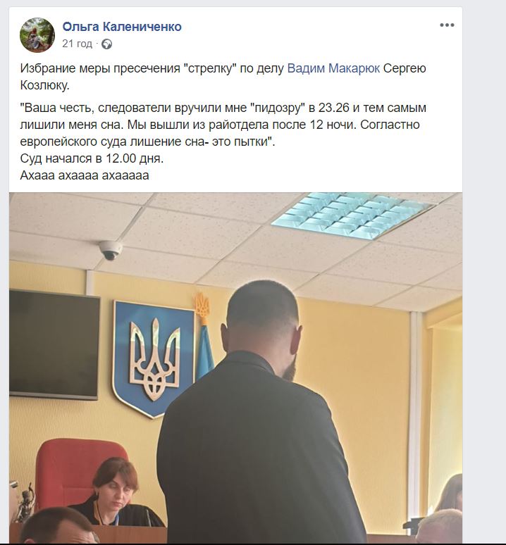 "Ваша честь, следователи вручили мне "пидозру" в 23.26 и тем самым лишили меня сна. Мы вышли из райотдела после 12 ночи. Согласно европейского суда лишение сна - это пытки". Суд начался в 12.00 дня", - пишет журналистка Ольга Калениченко