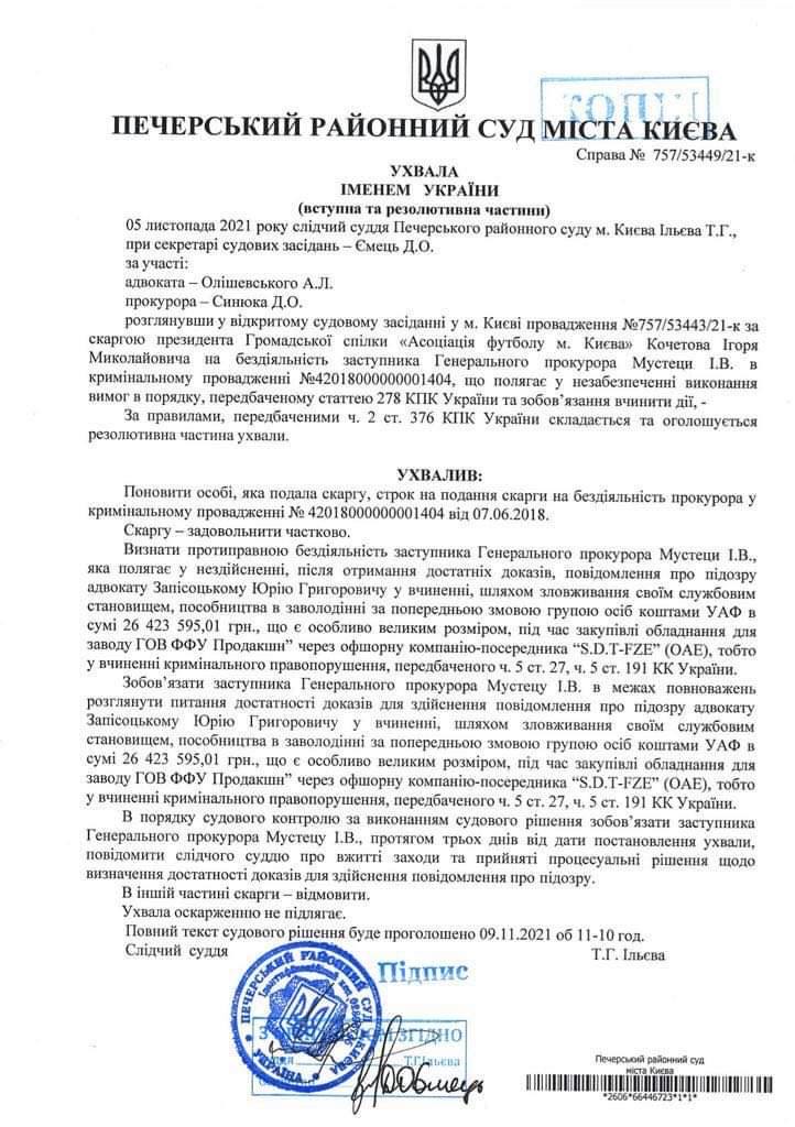 В частности, 5 ноября судья удовлетворила жалобу соратника братьев Суркисов, активиста ОО "Ассоциация футбола г. Киева" Игоря Кочетова и обязала своим определением вручить сообщение о подозрении двум представителям Украинской ассоциации футбола.