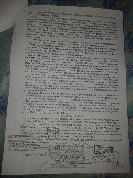 Из Ялты Погодина перевезли в изолятор следственного содержания в Симферополе. Он задержан на 40 суток. Также сообщается, что в соответствии с соглашениями с Интерполом Россия готова выдать боевика Украине. Ему инкриминируют ч. 2 ст. 115 УК Украины (умышленное убийство заложника или похищенного человека, совершенное по предварительному сговору группой лиц) и ч. 3 ст. 146 УК Украины (незаконное лишение свободы или похищение человека).
