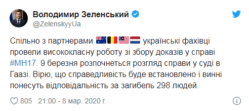 Зеленский выразил надежду, что на суде будет установлена справедливость и виновные понесут ответственность.