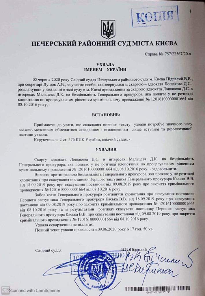 Суд удовлетворил жалобу адвоката о бездеятельности генпрокурора и признал противоправным нерассмотрение ходатайства об отмене постановления Виталия Касько как такого, которое было вынесено незаконно. Речь идет о постановлении о возобновлении уголовного дела о рефинансировании VAB банка, которое уже расследовалось и было закрыто решением судов из-за отсутствия состава преступления. Во исполнение решения суда генпрокурор должен отменить постановление. Решение окончательное и обжалованию не подлежит.