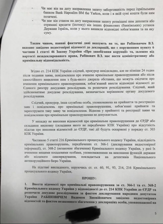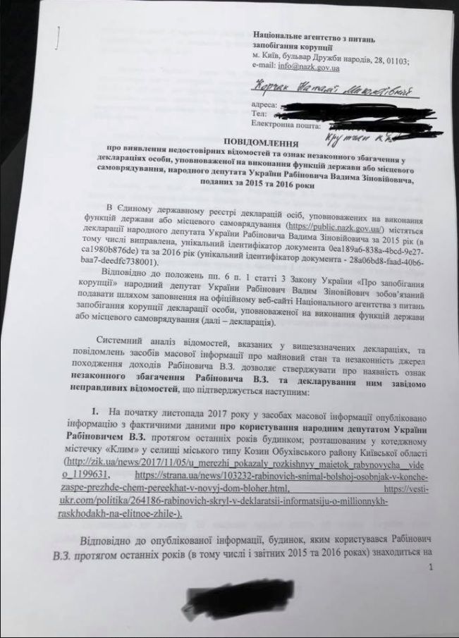 В опубликованных Крутчаком копиях документов идет речь о том, что Вадим Рабинович не стал указывать в своих декларациях о доходах за 2015 и 2016 годы дом в Обухове площадью 600 кв. м, который якобы арендует депутат. При этом, расходы на аренду подобного строения в подобном районе за 2 года, по подсчетам Крутчака, составляют от 5,8 до 8,4 млн гривен.