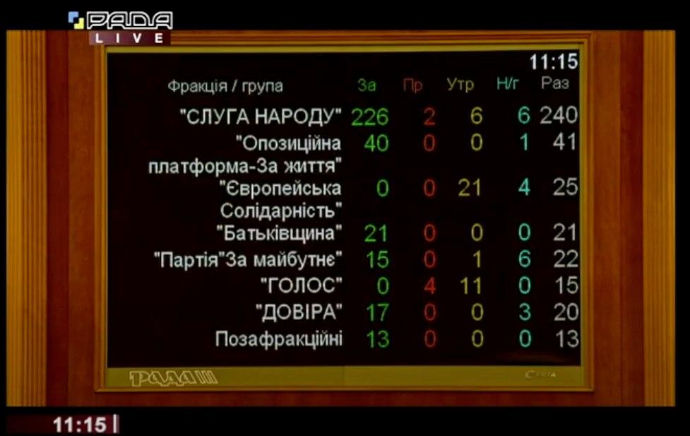 Голоса по фракциям разделились следующим образом: "Слуга народа" - 226, "Оппоплатформа" - 40, "Евросолидарность" - 0, "Голос" - 0, "Батькивщина" - 21, группа "За будущее" - 15, группа "Доверие "- 17, внефракционные - 13.