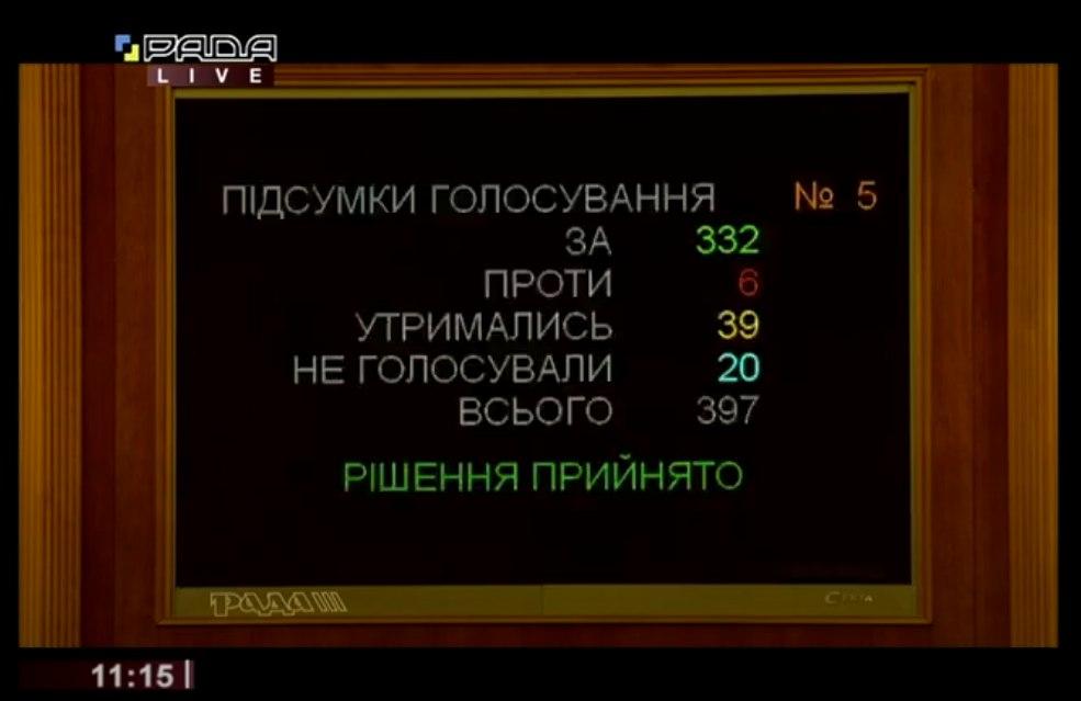 Проект постановления ВРУ, внесенный президентом Владимиром Зеленским, поддержали 332 депутата.