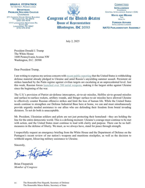 Республиканский конгрессмен Брайан Фицпатрик направил президенту Соединенных Штатов Дональду Трампу письмо с требованием возобновить поставки военной помощи Украине и призывом собрать по этому поводу экстренный брифинг для Конгресса. Также с заявлениями по возобновлению помощи выступили некоторые демократы.