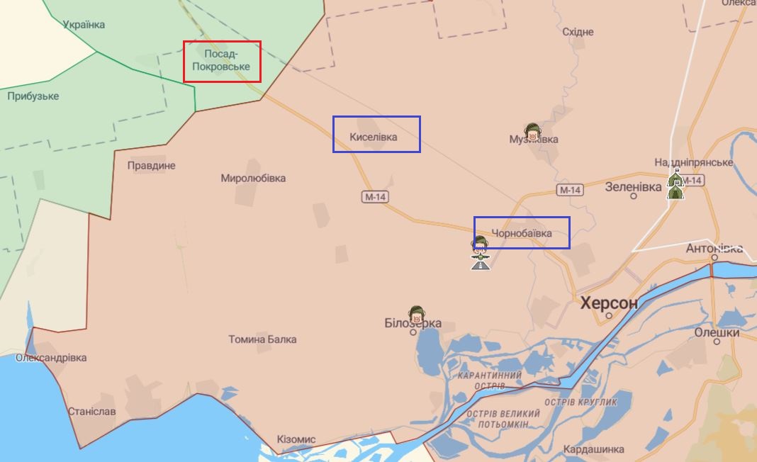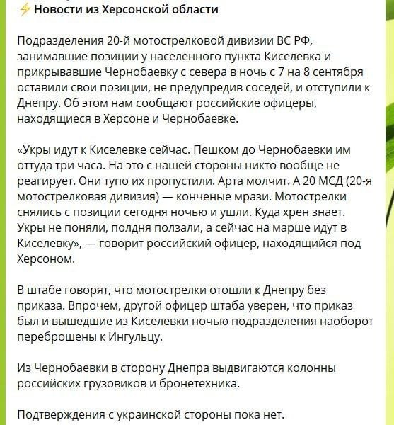 20:15 На Херсонском направлении ВСУ тоже пошли вперед. Рашисты кричат, что украинским силам удалось прорвать оборону у Посада-Покровского на Киселевку, откуда открывается дорога на Чернобаевку под Херсоном.