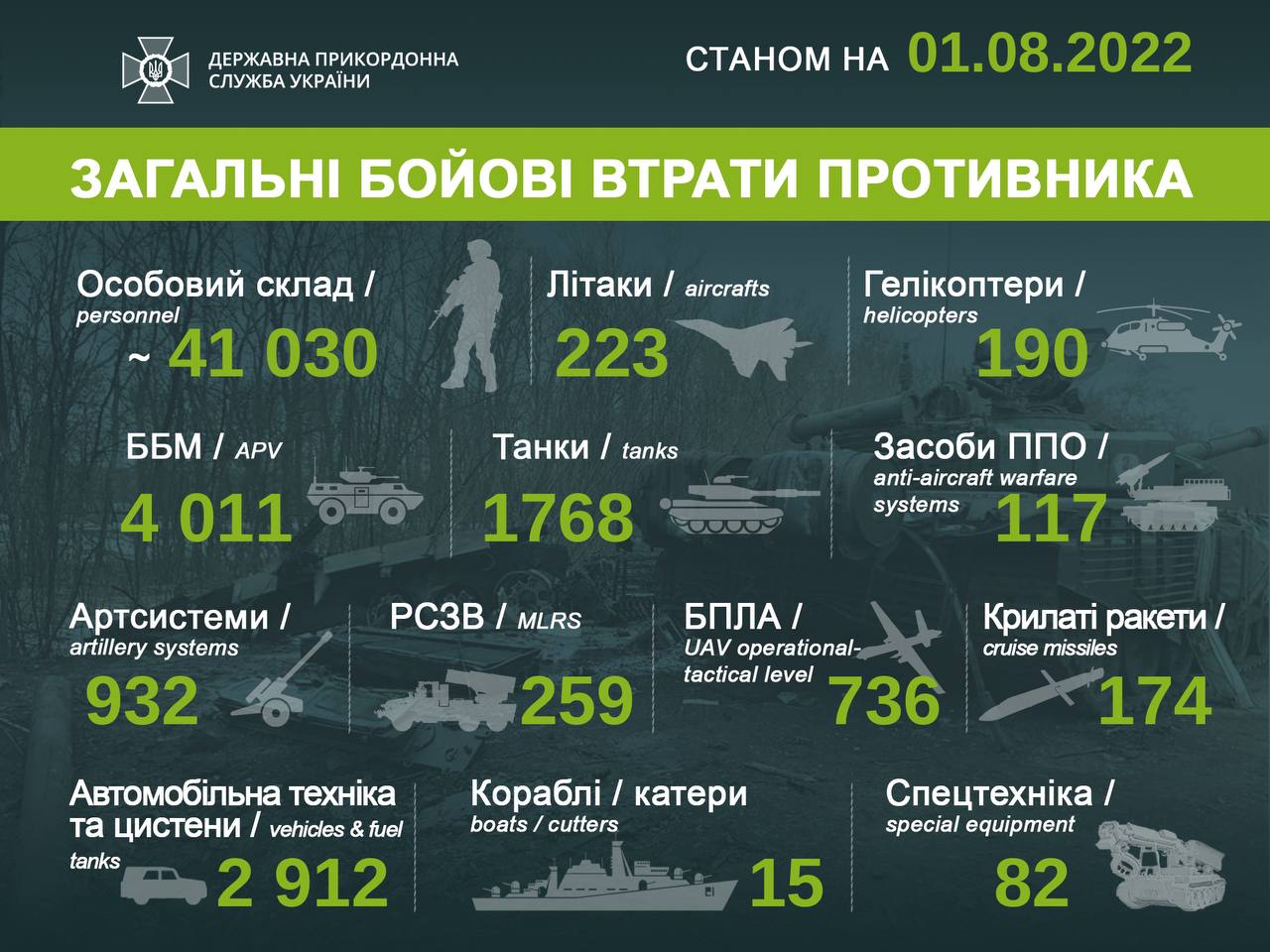 09:10 К утру 1 августа потери оккупантов превысили 41 тысячу "штыков", при этом за последние сутки враг потерял убитыми 200 человек.