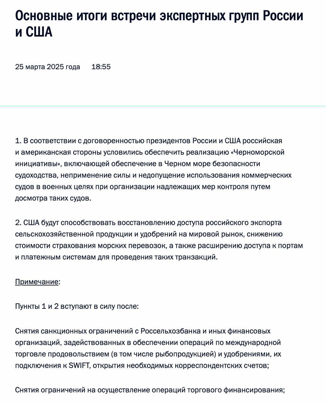 В заявлении, в частности, говорится, что пункты о безопасности в Черном море и возобновлении российского экспорта сельхозпродукции начнут действовать после снятия санкций с российских производителей и экспортеров продовольствия.