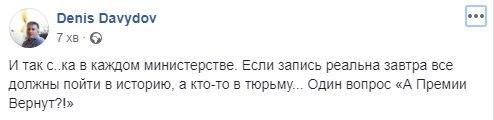 "Мы имеем дело с опасными идиотами. Послушайте, что городит премьер", "И так с*ка в каждом министерстве. Если запись реальна, завтра все должны пойти в историю а кто-то в тюрьму. Один вопрос: "А премии вернут?" - реагируют на опубликованную запись в соцсетях.