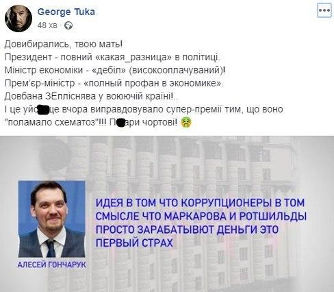 "Довыбирались. Президент - полный "какая_разница" в политике. Министр экономики - "дебил" (высокооплачиваемый!). Премьер-министр - "полный профан в экономике". Долбаная Зеплесень в воюющей стране", - написал, в частности, бывший заместитель министра по вопросам временно оккупированных территорий и внутренне перемещенных лиц Георгий Тука.