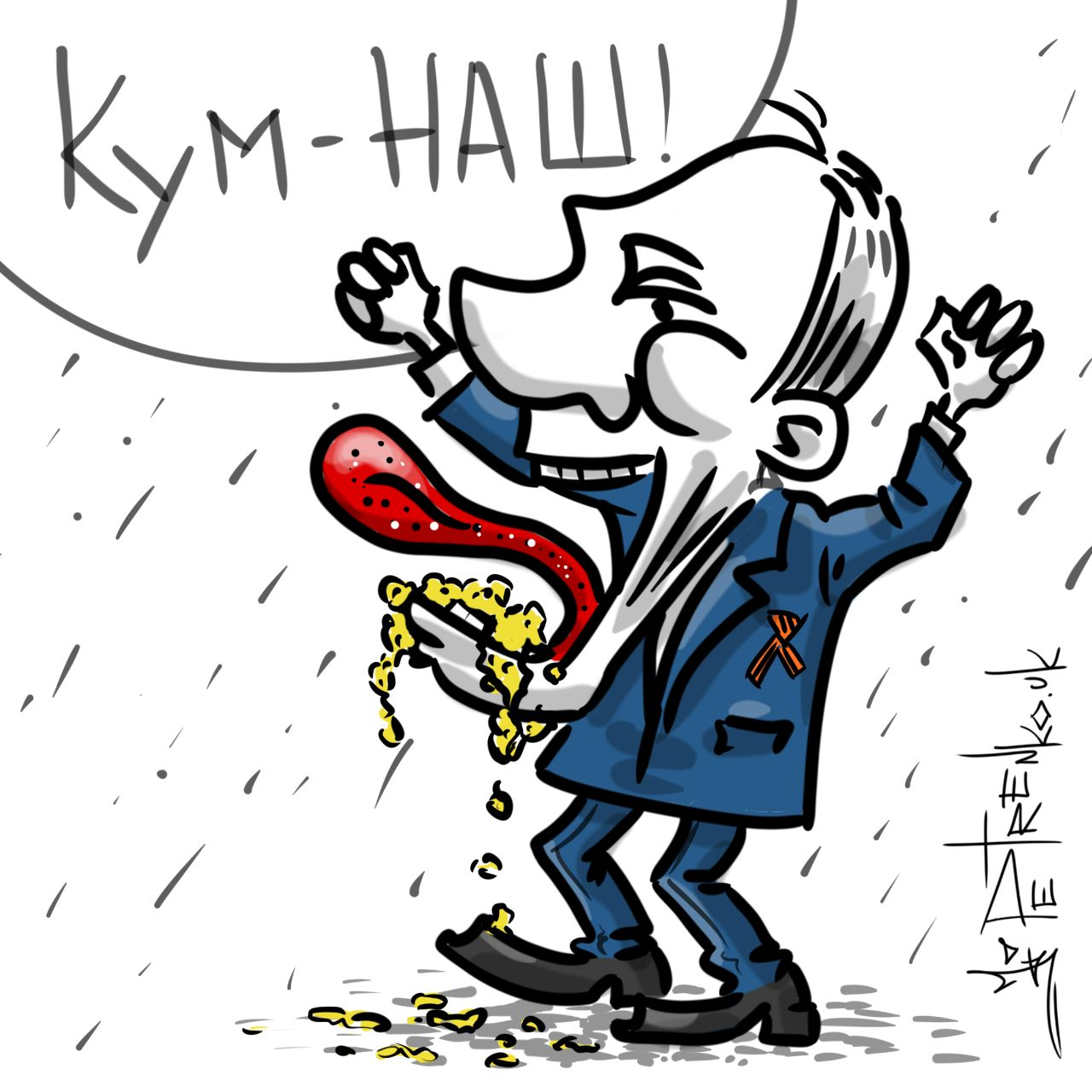 На рисунке художник изобразил президента РФ, который кричит фразу "Кум - наш". Таким образом автор работы хотел провести аналогию со ставшей уже популярной фразой про "Крым - наш", которую активно начали использовать после незаконной аннексии Крыма.