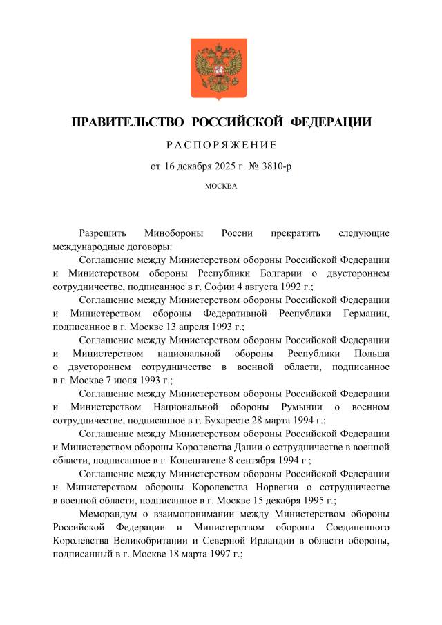 Как отмечается, Минобороны должно прекратить соглашение о сотрудничестве в военной сфере с Германией, Польшей, Румынией, Данией, Норвегией, Нидерландами, Хорватией, Бельгией и Чехией. Также разрешается прекратить меморандум о взаимопонимании с Великобританией в области обороны.