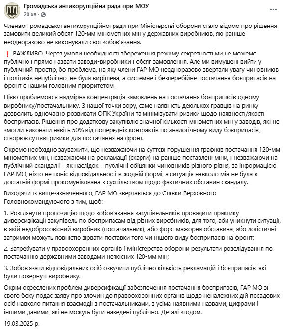 Эта проблема - чрезмерная концентрация заказов на поставку боеприпасов одному производителю/поставщику. С нашей точки зрения, именно наличие нескольких игроков на рынке позволит одновременно развивать ОПК Украины и минимизировать риски наличия/качества боеприпасов. Решение о дополнительной закупке значительного количества минометных мин у заводов, которые не смогли выполнить даже 50% предварительных контрактов по аналогичному виду боеприпасов, создает существенные риски для поставки на фронт", - говорится в сообщении.