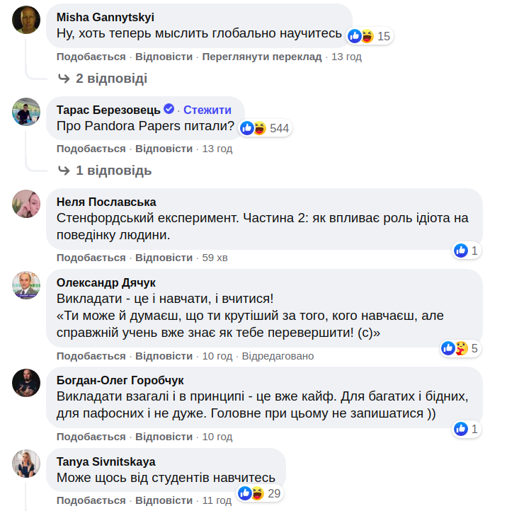 Одна из пользовательниц задала Гончаруку вопрос, о каких кейсах и достижениях, либо успешных реформах он рассказывает студентам. Ответа предсказуемо не последовало.