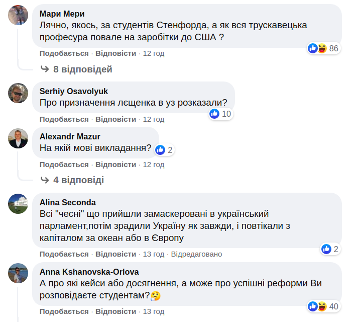"Может чему-то от студентов научитесь", "Страшно как-то за студентов Стэнфорда, а если вся трускавецкая профессура повалит на заработки в США", - пишут комментаторы.