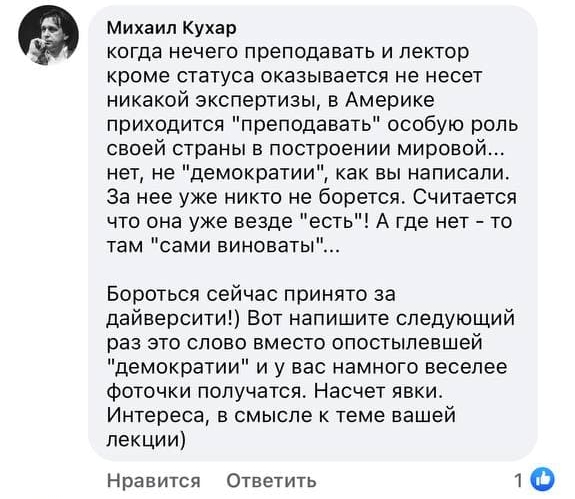 "Когда нечего преподавать и лектор кроме статуса оказывается не несет никакой экспертизы, в Америке приходится "преподавать" особую роль своей страны в построении мировой... нет, не "демократии", как вы написали. За нее уже никто не борется. Считается что она уже везде "есть"! А где нет - то там "сами виноваты", - пишет один из комментаторов.