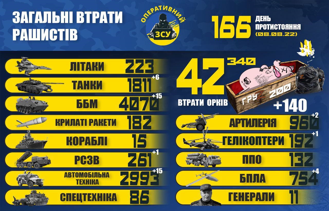 09:25 За 166 дней войны украинские военные уничтожили 42 340 оккупантов.