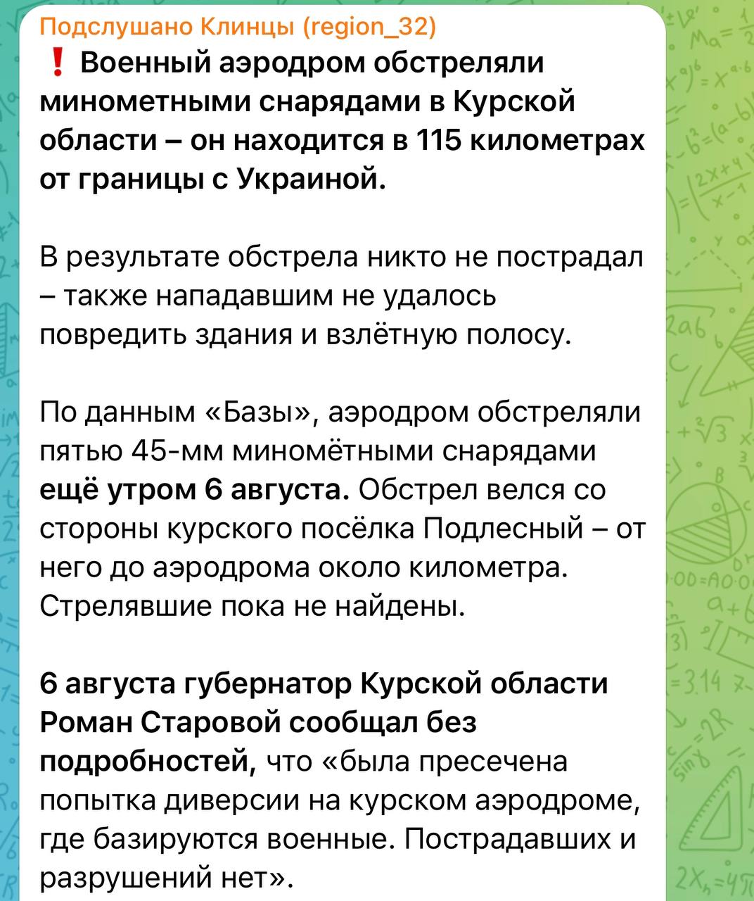15:41 В Курской области РФ неизвестные из минометов обстреляли военный аэродром в глубоком тылу. До границы с Украиной от места обстрела более 100 км. Минометы не могли бы работать на такое расстояние с территории Украины. А это значит: