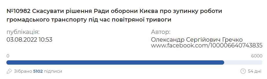 13:50 В Киеве хотят отменить запрет на движение транспорта при воздушной тревоге как необоснованный и вредный. Частные перевозчики продолжают ездить по городу, а коммунальный транспорт останавливается, что никак не повышает безопасность движения по столице. До требуемых 6000 голосов осталось менее тысячи.