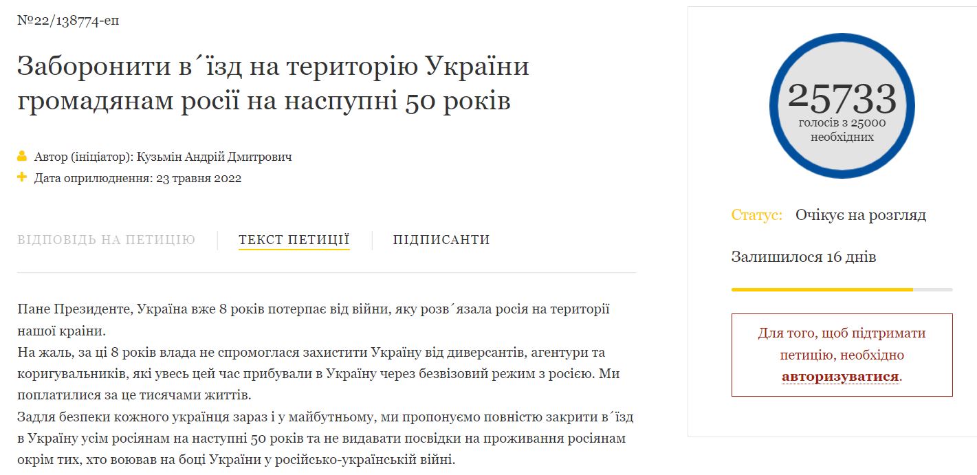 11:35 Петиция президенту о запрете на въезд в Украину россиянам на 50 лет набрала нужное количество голосов, теперь ее должен рассмотреть Владимир Зеленский. Исключением могут стать только россияне, воевавших на стороне Украины.