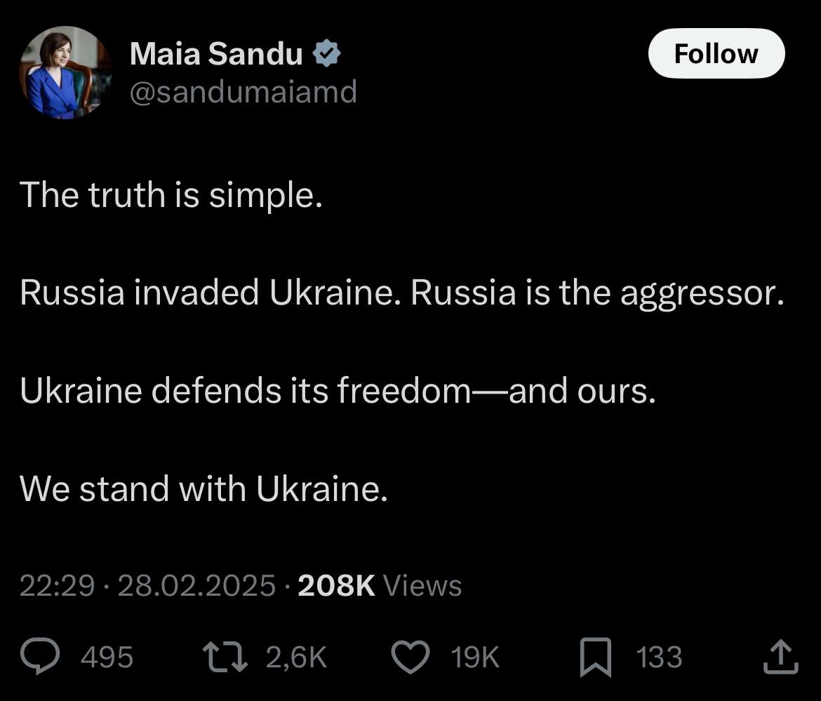 "Истина проста. Россия напала на Украину. Россия - агрессор. Украина защищает свою и нашу свободу. Мы с Украиной", - говорится в сообщении.
