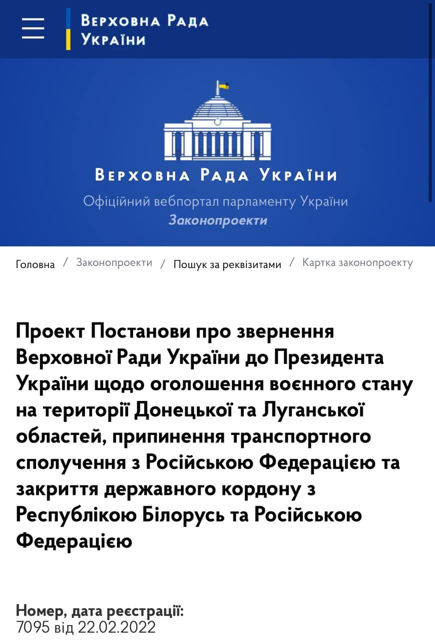8:14 В ВР внесли новый Проект Постановления "об объявлении военного положения на территории Донецкой и Луганской областей, прекращении транспортного сообщения с Российской Федерацией и закрытии государственной границы с Республикой Беларусь и Российской Федерацией".