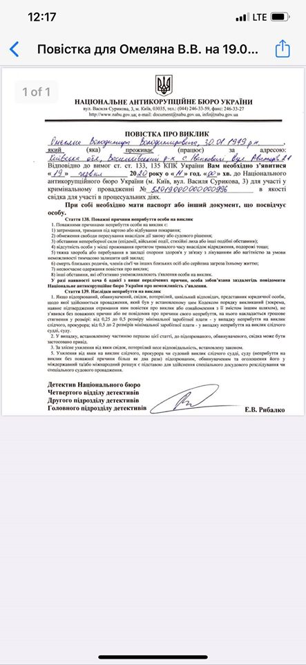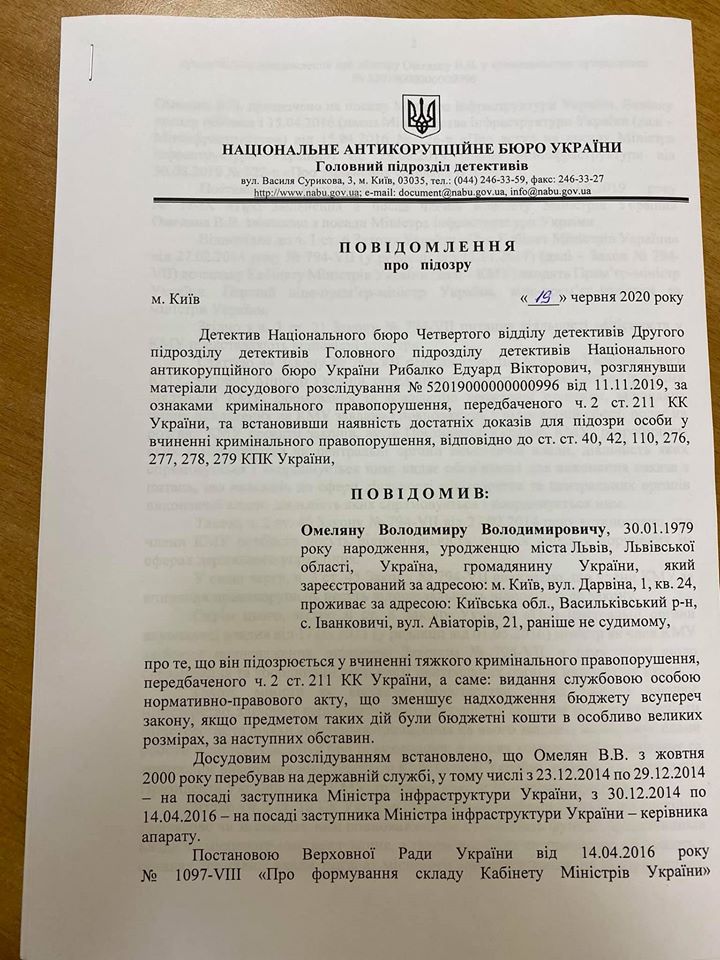 Об этом Омелян сообщил на своей странице в Facebook 19 июня, где опубликовал фото повестки о вызове на допрос в НАБУ и сообщения об объявлении подозрения.