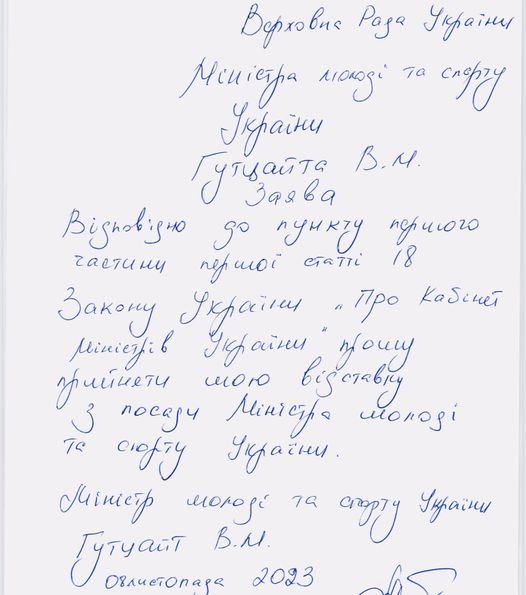 "В Верховную Раду Украины поступило заявление Министра молодежи и спорта Украины Гутцайта В.М. об отставке", - написал глава депутатского корпуса и выложил фото заявления министра.