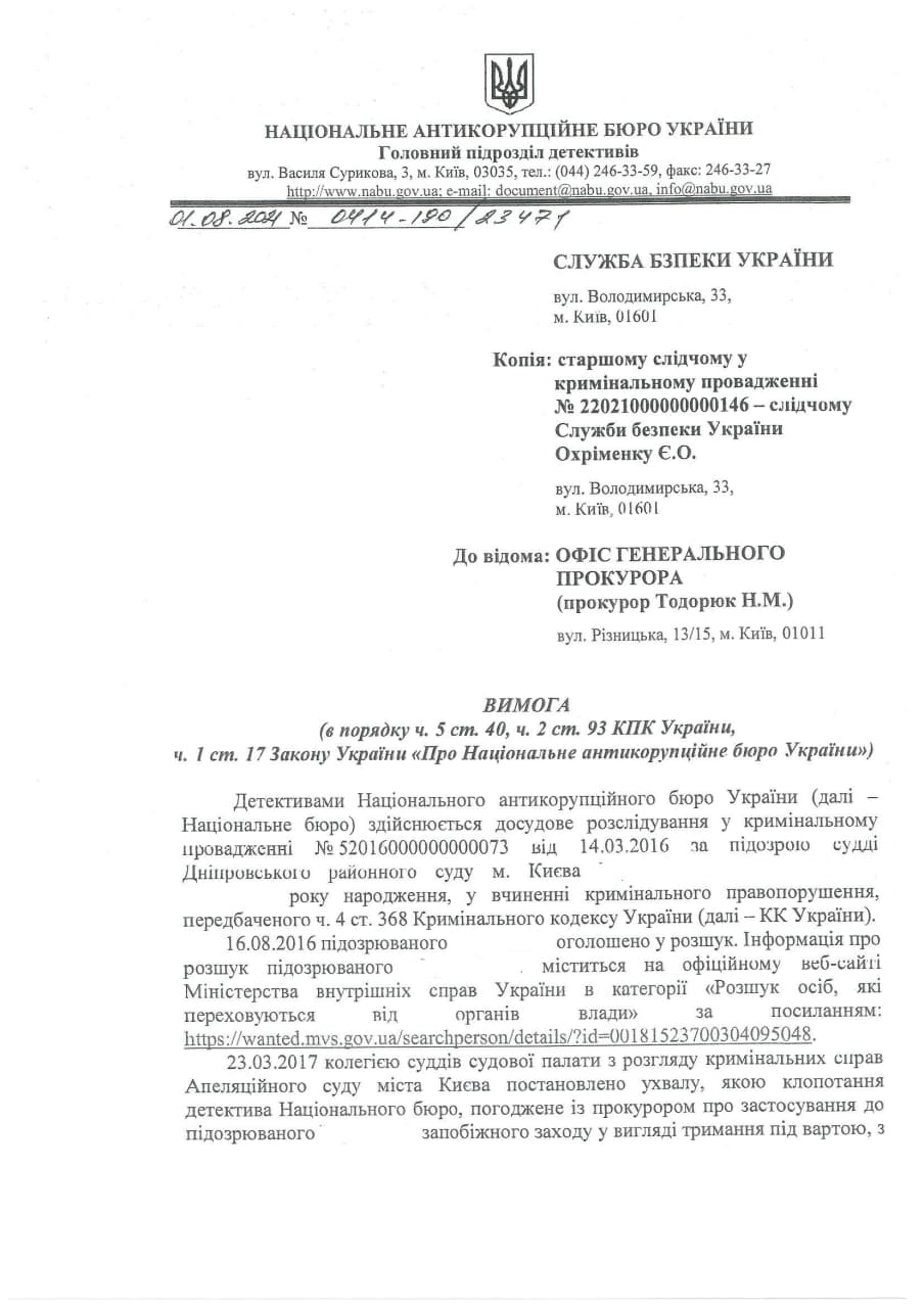НАБУ в очередной раз призвало СБУ доставить подозреваемого уполномоченным детективам и в ВАКС в 14:00 4 августа 2021 для рассмотрения вопроса о применении меры пресечения в виде содержания под стражей.