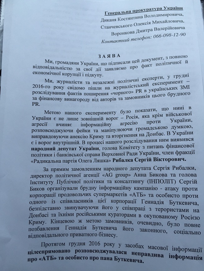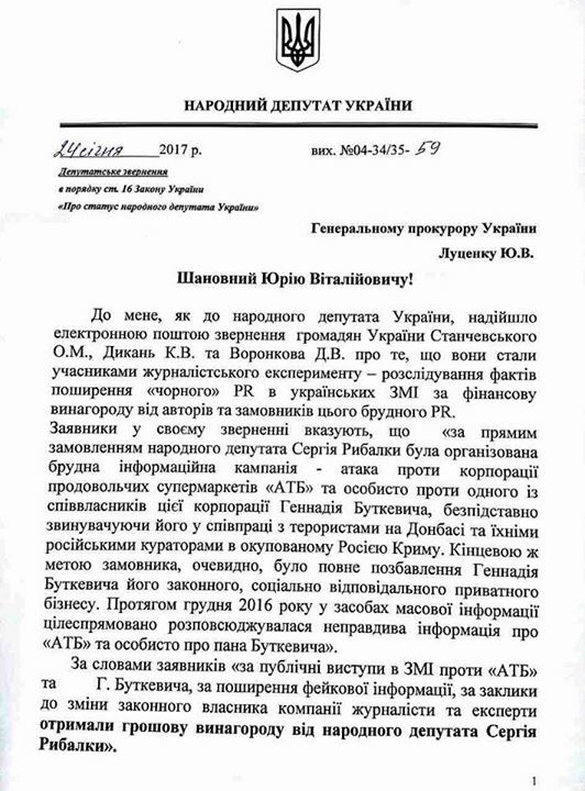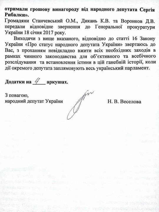 "За публичные выступления в СМИ против "АТБ" и Геннадия Буткевича, за распространение фейковой информации, за призывы к смене законного владельца компании журналисты и эксперты получали денежное вознаграждение от народного депутата Сергея Рыбалки. Граждане Станчевский А.М., Дикань К.В. и Воронков Д.В. передали соответствующее обращение в Генеральную Прокуратуру 18 января 2017 года", говорится в обращении Веселовой к ГПУ и СБУ с требованием провести тщательное и беспристрастное расследование фактов политической коррупции нардепа от Радикальной партии.