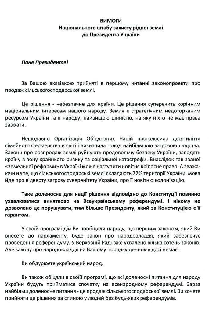 Национальный штаб утвердил требования к президенту Владимиру Зеленскому, в которых говорится о необходимости отложить принятие земельных законов, продлить мораторий и объявить референдум - дав народу самостоятельно решить, продавать сельскохозяйственную землю или нет.