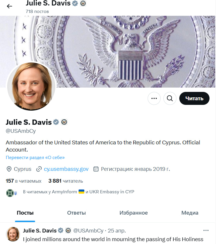 Ранее Джули Дэвис была послом США на Кипре. До этого назначения занимала должность специального посланника по Беларуси в Вильнюсе, Литва.