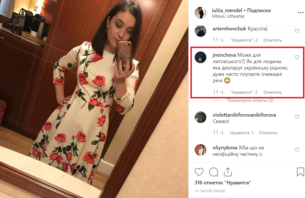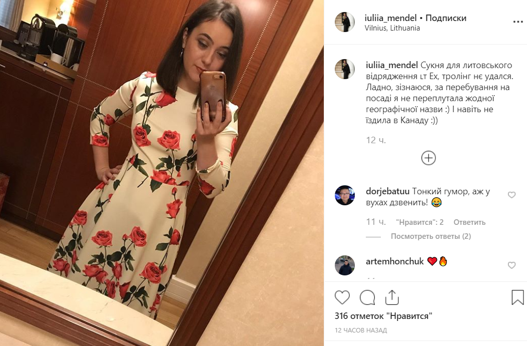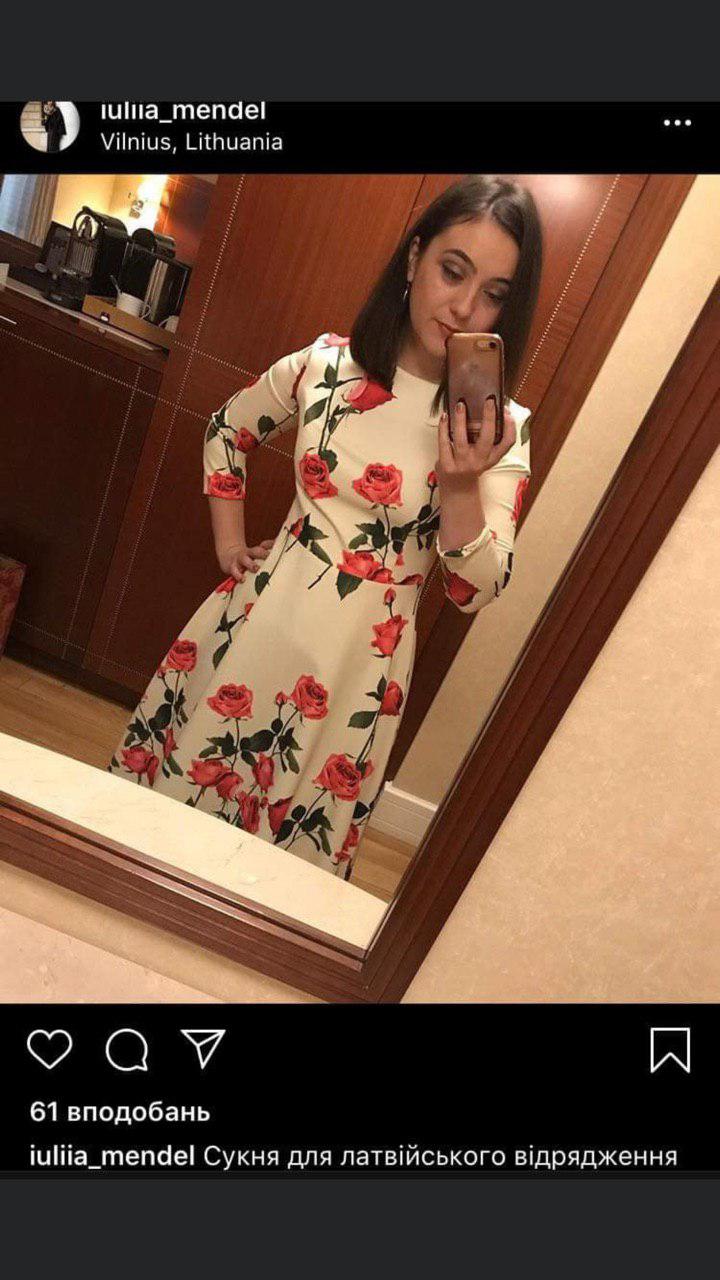 "Платье для литовской командировки. Эх, троллинг не удался. Ладно, признаюсь, за пребывание в должности я не перепутала ни одного географического названия и даже не ездила в Канаду:)" – написала в новом посте Мендель.
