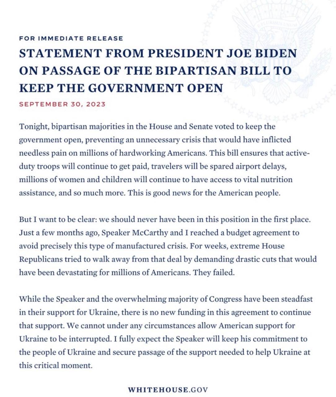 "Хотя спикер и подавляющее большинство Конгресса были непоколебимы в своей поддержке Украины, в этом соглашении нет нового финансирования для продолжения этой поддержки. Мы ни при каких обстоятельствах не можем допустить, чтобы американская поддержка Украины была прервана. Я полностью надеюсь, что спикер будет придерживаться своей преданности народу Украина и обеспечит поддержку, необходимую для помощи Украине в этот критический момент", - заявил Байден.